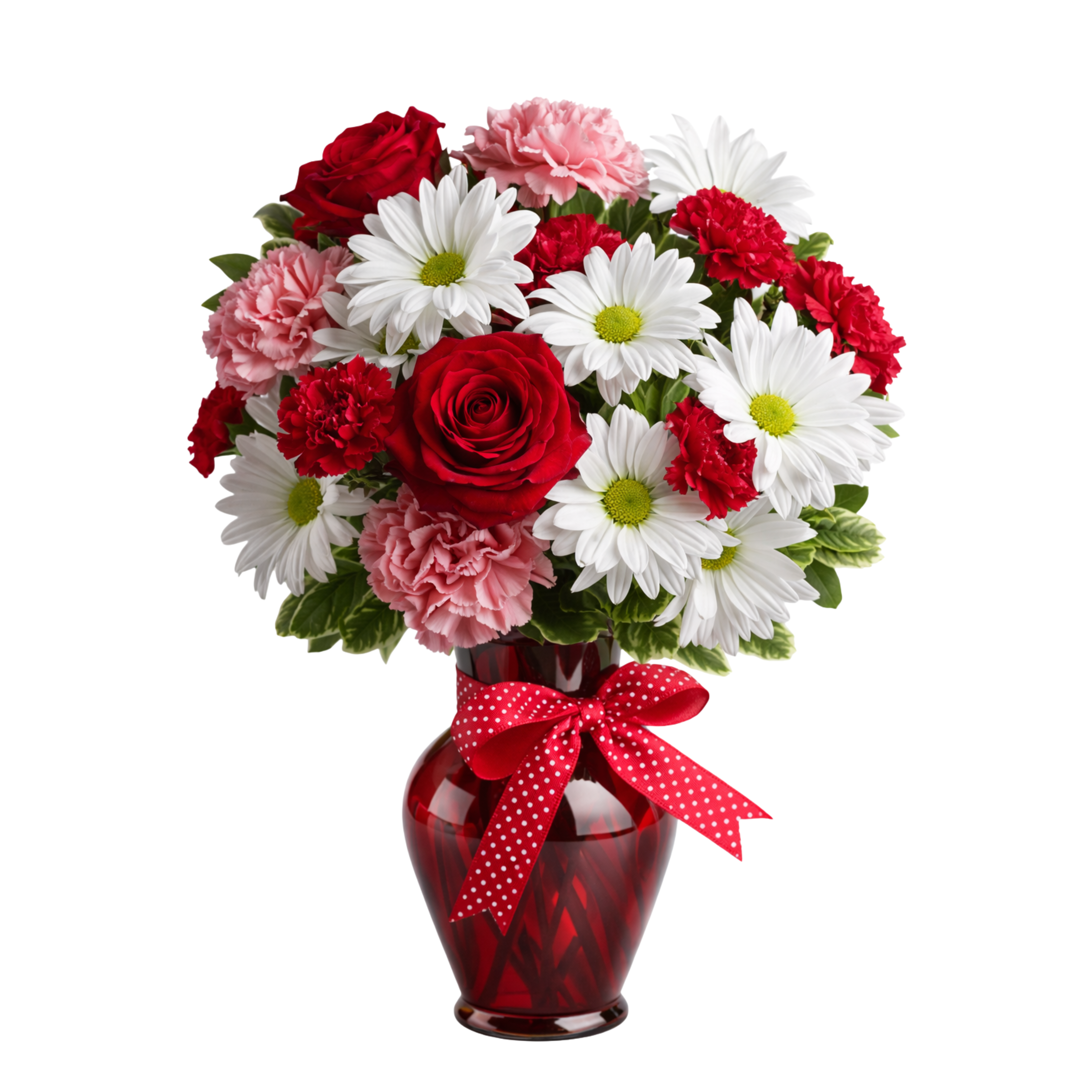 Cheerful, classic, and full of heart, this lovely arrangement features rich red roses paired with crisp white daisies and soft pink carnations. Accented with fresh greenery and finished with a playful polka-dot ribbon, the bouquet is beautifully designed in a deep red glass vase for a charming and festive presentation.